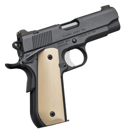 Pistola Kimber 1911 mod. Classic Carry Pro in cal. 45ACP , tacca di mira fissa e mirino al trizio, canna da 4″. Arma con standard qualitativi elevati e una precisione eccezionale, venduta completa di valigetta in ABS.