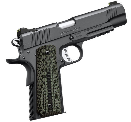 Pistola Kimber 1911 mod. Custom TLE/RL II in cal. 45ACP, questo modello ha le stesse caratteristiche del modello Custom TLE II ma, in più ha il rail inferiore per poter montare accessori tattici come torce ecc… Arma con standard qualitativi elevati e una precisione eccezionale, venduta completa di valigetta in ABS.
