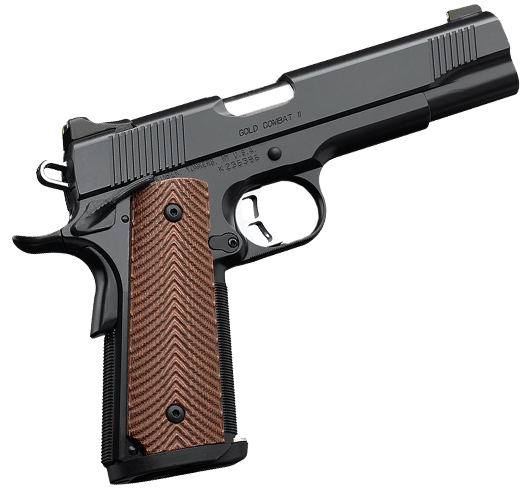 Pistola Kimber 1911 mod. Gold Combat II in cal. 45ACP, organi di mira fissi al trizio e canna pesante “bushingless” da 5″. Arma con standard qualitativi elevati e una precisione eccezionale, venduta completa di valigetta in ABS.