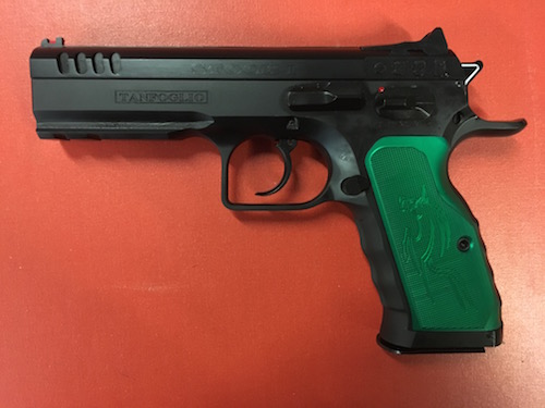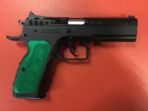 Pistola semiautomatica Tanfoglio mod. Stock I UNICA in cal. 9×21, canna da 4.40″, fornita in valigetta con caricatore di scorta da 15 colpi, questa versione si differenzia dal modello standard perchè monta parti custom della linea UNICA di Tanfoglio: (cane, percussore, sear, molle alleggerite del percussore e del cane, guancette in alluminio anodizzate verdi con grip texture molto performante e mirino in fibra ottica)